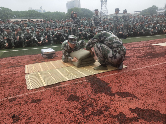 同时,为检验新生在军训中内务整理的学习情况,叠军被比赛也拉开帷幕。各连队代表在一片加油喝彩声中保持沉着冷静。最终,一个个标准的“豆腐块”,展现出了连队中严肃的军纪作风。