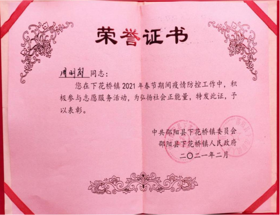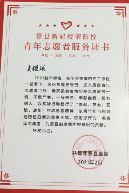 2021年是中国共产党成立100周年,是“十四五”规划开局之年。为引领广老员工深入学习贯彻习近平新时代中国特色社会主义思想和党的十九届五中全会精神,扎根中国大地了解国情民情,通过社会实践坚定理想信念、站稳人民立场、练就过硬本领、投身强国伟业。在本次组织开展的2021年寒假社会实践活动中,公司能动1801班杨溯倬、机类2003班王天宇、机类2004班周明朗、能动1902班吴文旭、机类2017班夏耀城、机类2005班李政霖、机类2007班顾洪哲、智造1801班赵泓铮、智造1801班郭明延、机械1902班邹佳华等10名同学积极投身到家乡疫情防控工作中去,将浓浓的爱国之情化作坚定的报国之行,用实际行动为打赢疫情防控阻击战贡献青春力量,荣获“优秀志愿者”称号。