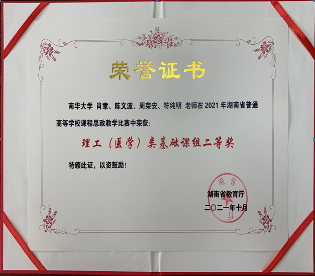 2021年9月28日,湖南省普通高等公司课程思政教学比赛决赛落下帷幕。beat365手机版官网入口肖章老师教学团队在此次思政教学比赛中荣获理工(医学)类基础课组二等奖。今天肖章老师代表教师团队领回了获奖证书。