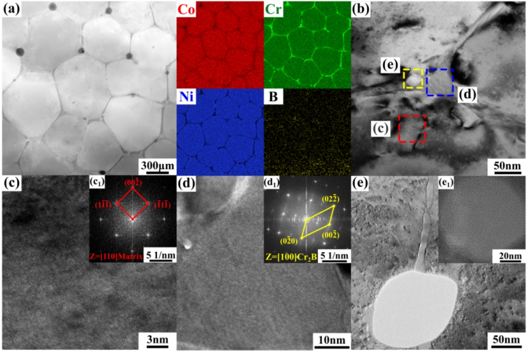 图2采用LPBF制备的CCN-0.8B合金的TEM图和相应元素分布图:(a)相应区域的明场像和元素分布;(b) Cr2B/基体界面的HR-TEM图;(c-c1)基体的HR-TEM图和FFT图;(d-d1) Cr2B的HR-TEM图和FFT图;以及(e-e1)富B沉淀相的HR-TEM图和FFT图