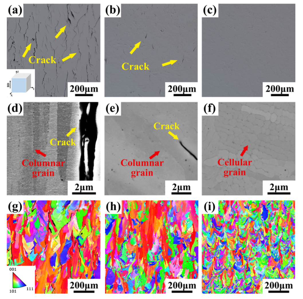 图1采用LPBF设备制备CCN、CCN-0.4B和CCN-0.8B合金的微观结构:(a)-(c)光学显微镜(OM)图;(d)-(f)扫描电子显微镜(SEM)图;(g)-(i)电子背散射衍射(EBSD)图