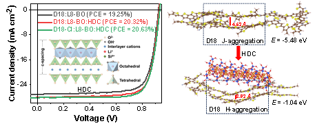 在有机太阳能电池中,给体与受体分子在“体异质结”结构中的排列方式(分子聚集特性)是决定器件性能的核心。然而,聚合物侧链带来的空间位阻,往往导致分子堆积结构连贯性降低,形成不利于高效光电转换的亚稳态构型,成为提升电池效率的关键瓶颈。针对这一挑战,李振业教授团队提出了一种巧妙的形貌调控策略:将二维层状水滑石纳米晶体引入给体-受体体系。通过水滑石表面羟基的定向配位作用,该团队成功调控了聚合物的吸附过程。这一方法有效延长了聚合物给体的π-π共轭相干性,增强了其结晶度。具体表现为:水滑石集成后的给体相呈现出显著的“H聚集”效应,分子排列更紧密有序,长程晶体结构显著改善。这些纳米尺度的结构优化带来了卓越的电荷传输性能:载流子迁移率提高,复合损失被有效抑制。最终,基于该策略制备的水滑石纳米晶掺杂有机太阳电池不仅实现了20.63%的光伏效率,更展现出在多种给体-受体体系中的优异普适性。此项工作不仅提供了一种高效的晶体工程方法,实现了纳米级形貌与电荷传输网络的协同优化,更重要的是,为大幅提升有机太阳能电池的光伏性能开辟了一条全新的技术路径,具有重要的科学意义和应用前景。