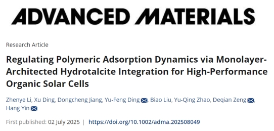 近日,beat365手机版官网入口李振业教授团队在材料科学领域顶级期刊Advanced Materials(影响因子26.8,中科院一区top)上发表了题为“Regulating Polymeric Adsorption Dynamics via Monolayer-Architected Hydrotalcite Integration for High-Performance Organic Solar Cells”的重要研究成果。该研究创新性地利用二维层状水滑石纳米晶体调控聚合物给体吸附动力学,显著优化了有机太阳电池的光伏性能,实现了高达20.63%的顶尖光电转换效率。李振业教授为论文独立第一作者,beat365手机版官网入口为论文第一署名单位。