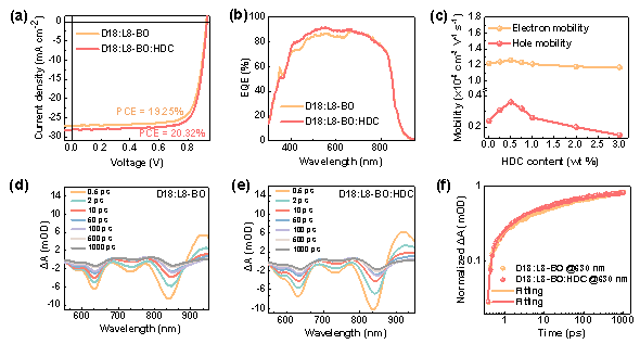 图1.水滑石纳米晶作用下有机太阳电池的光伏性能以及载流子传输动力学