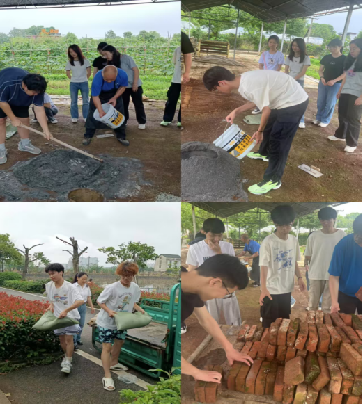 活动伊始,刘灯老师为大家讲解灶台的构造以及灶台各构造的作用,同学们对灶台有了初步了解。讲解结束后,搭建灶台正式开始。同学们分工明确:有人负责搬运砖头、水泥、沙子等材料,有人混合水泥沙土,不断调整搅拌方法,直至材料均匀可用。在材料准备好后开心农场的工作人员详细讲解了搭建的步骤和要点,亲自示范如何正确搭建才能让灶台更稳固。同学们开始动手搭建。过程中,有砖块摆放不齐、泥土粘合不牢等问题,但同学们在农场工作人员的指导下解决问题,老师也积极参与指导。经过努力,大家成功建造好一个稳固的灶台。