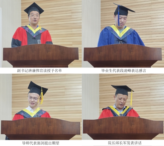 毕业生代表和导师代表相继发言。毕业生代表段凌峰引用“饮其流者怀其源”表达了对母校的眷念和对恩师的感谢,他说作为硕士毕业生,肩负着更多的责任和期待,不断学习进步,为社会、国家贡献自己的力量;导师代表郭剑则对同学们提出一些期望:一是追求理想,永不言弃,二是脚踏实地,享受过程,三是乐观向上,感恩生活。希望毕业生们未来不管是顺境还是逆境,都要对自己充满信心。