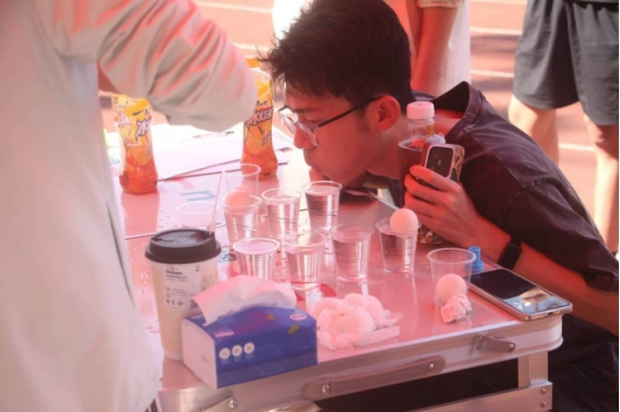 在“四渡赤水”项目中,选手需用嘴吹动乒乓球,让它依次漂过盛满水的纸杯。水面的阻力与不确定性使得挑战充满变数,稍有不慎球就会掉落重来。尽管如此,许多同学依旧坚持到底,在不断尝试中完成任务,赢得阵阵掌声。