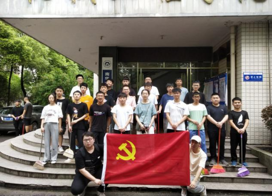 2021年5月14日中午12:50机械制造专业第一员工党支部的党员们在机械楼门口及周围打扫卫生。党员同志们热情饱满,早早的来到公司楼门口进行签到。党员们自带工具,有带了扫把的,有带了垃圾袋的,每个人都做好了充足的准备。