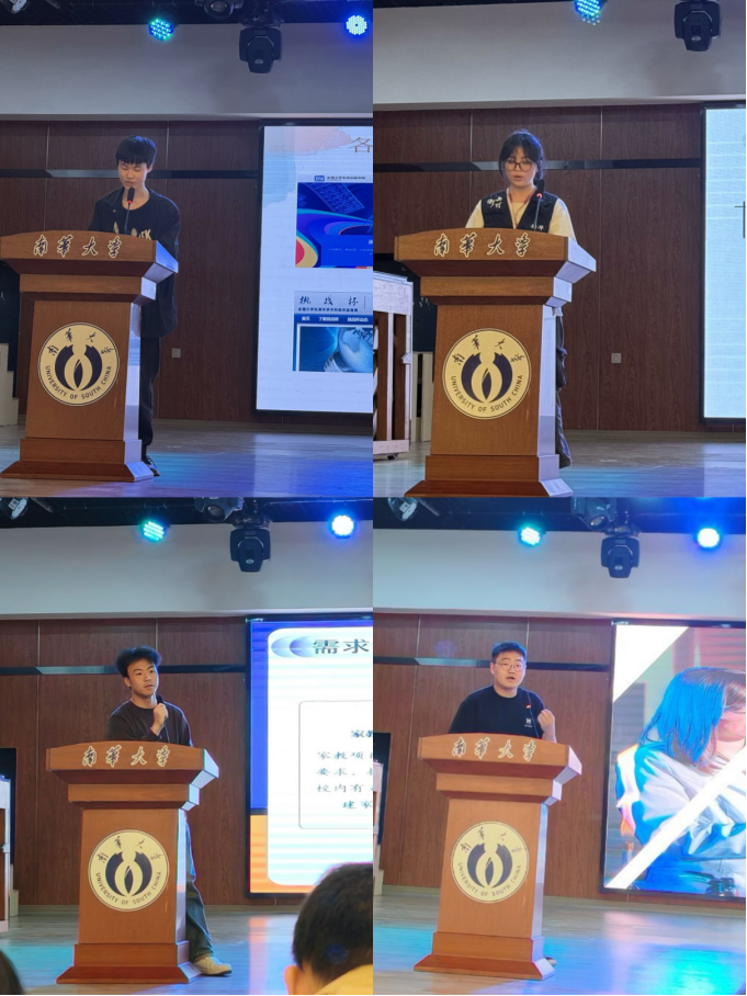 创新创业项目展示与经验分享环节将活动推向高潮。机卓 2101 班谢森超以“零件拼凑自信,汗水浇筑成长”为题,鼓励我们走出舒适圈,不轻言放弃,深入细节;智造 2201 班陈雪琴带来“新质生产力孵化器——机器人战队培养实战型人才的南华方案”,展示了衡山π战队项目的创新成果;智造 2202 班刘德元讲述“校园副业的成长密码——从探索到模仿到积累”,观察生活,从身边入手,大胆尝试;能动 2102 班裴华旭围绕“创新与实践——如何在实际项目中实现自我突破”,畅谈项目实践中的心得感悟,几位同学的分享精彩纷呈,干货满满,赢得现场阵阵掌声。